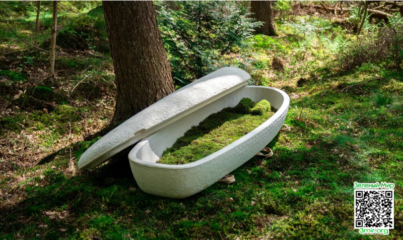 Сотрудники голландской компании Loop выпустили в 2020-м первый полностью биоразлагаемый гроб под названием Loop Living Cocoon ("Живой кокон Loop"). Он весит 30 килограмм, в длину составляет 216 см, в ширину – 75 см, а в высоту – 45 см. Его производят вручную из натуральных материалов следующим образом: