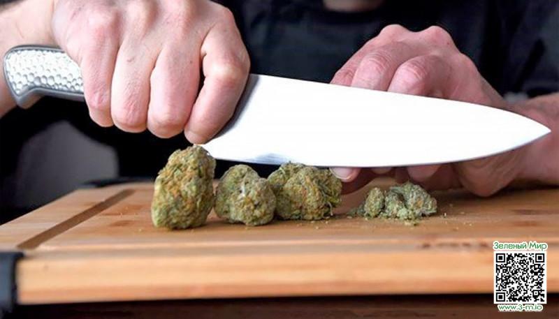 Нож и разделочная доска. Ок. Предположим, что ножницы вы где-то задевали. Придется воспользоваться самым пещерным способом, чтобы сэкономить время и подготовить коноплю к дегустации. Для этого возьмите кухонный нож, перед этим убедившись, что он чист и остр (вы же не хотите в процессе измельчения избавиться от хрупких трихом). Положите шишку покрупнее на разделочную доску, хорошенько зафиксируйте ее между пальцами и начинайте шинковку. Соблюдайте осторожность, чтобы не порезаться в процессе работы. Переработанный материал можно сгрести в горку и еще несколько раз пройтись по ней лезвием ножа, чтобы добиться нужной фракции конопли.