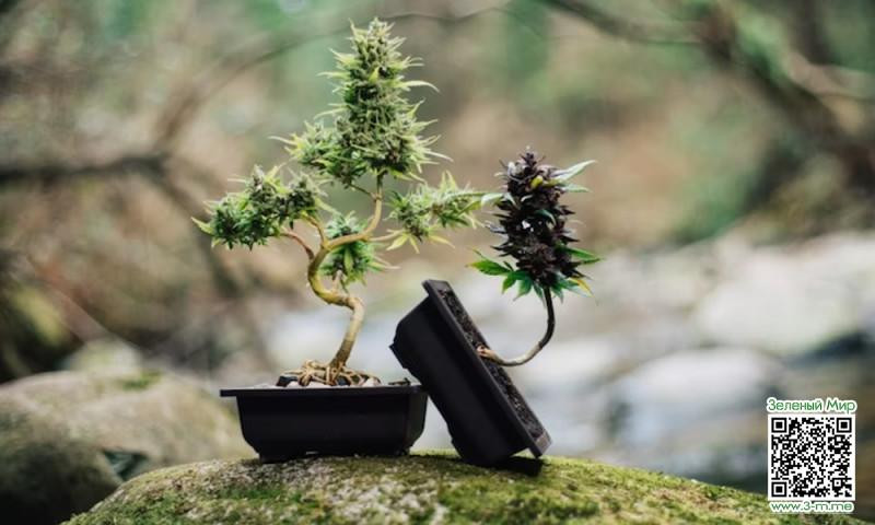 В Японии существует культ любования природой, но карликовый кустик-дерево конопли будет радовать глаз даже тех, в чьих жилах не течет самурайская кровь. Главная особенность такого искусства заключается в том, что растения бонсай не генетически карликовые, а приведены в такое состояние исключительно грамотным уходом. Специфические приёмы и особые техники позволяют садоводу создать настоящий шедевр, который к тому же может неплохо плодоносить.