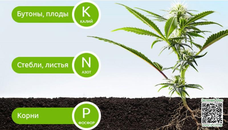 Основой рациона конопли в период формирования соцветий составляет фосфор (P). Фосфорные удобрения позволят поддерживать концентрацию данного макроэлемента в пределах нормы. На втором месте по значимости во время цветения идет азот (N) и калий (K). Азот в больших объемах поглощается в вегетационный период. Как только наступает цветение, лидерство переходит к фосфору, а к концу формирования соцветий – к калию.