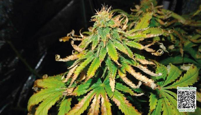 Если листья выглядят хрустящими с подгоревшими краями, необходимо промыть растение сбалансированной по pH водой с низким содержанием питательных веществ (1/4 от рекомендуемой дозы). После промывки необходимо слить всю сточную воду и дать растению отдых от питательных веществ на пару недель, до заживления листьев.