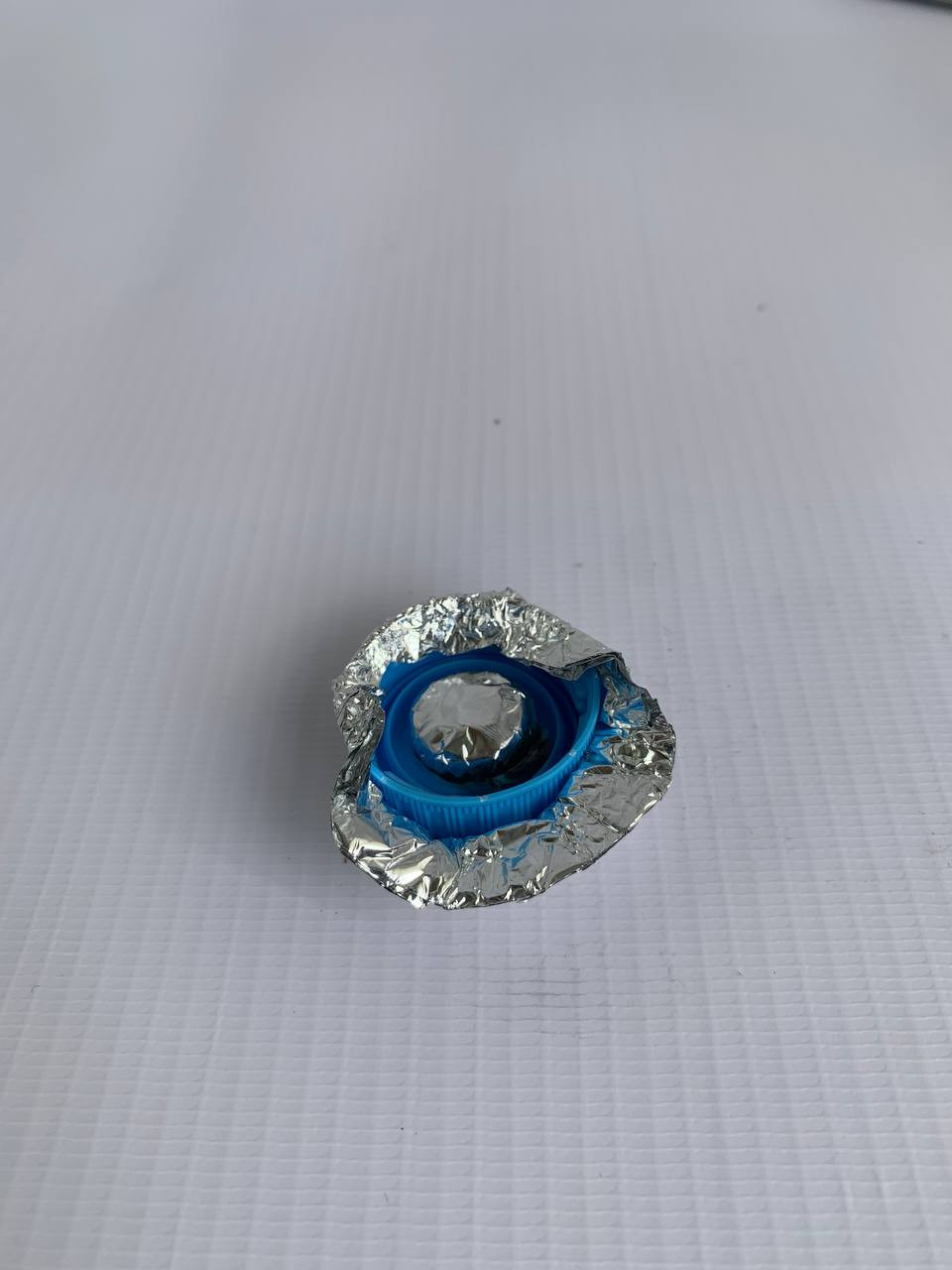 2) Центр фольги наматываем на батарейку и засовываем в дырку на крышке