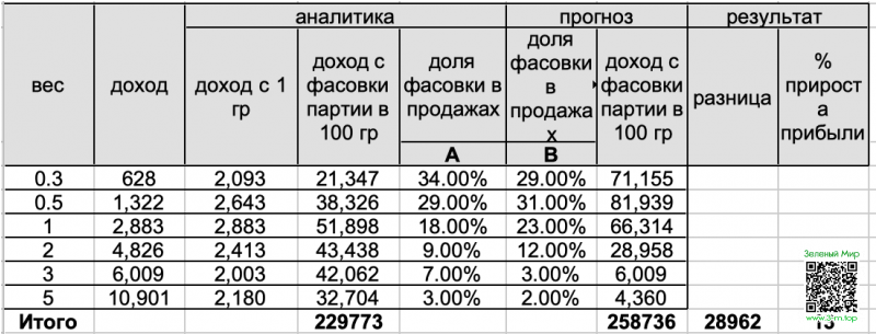 - Доход с 1 гр - пересчет дохода за 1 гр. исходя из цены продажи фасовки, для унификации расчетов