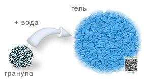 Полимерные цепочки изначально находятся в сжатом состоянии, при добавлении воды они расходятся и вода проникает внутрь. Происходит набухание гранул с образованием гидрогеля.