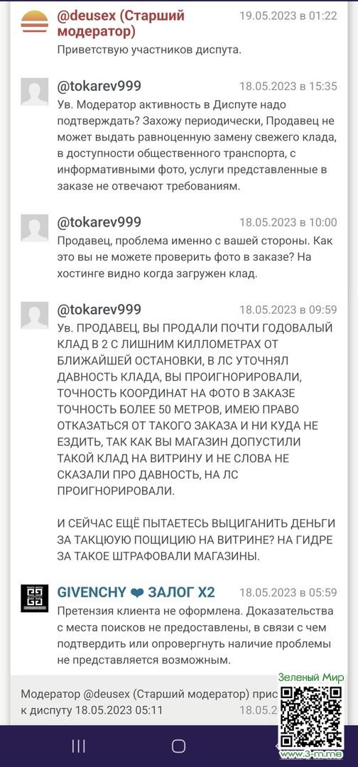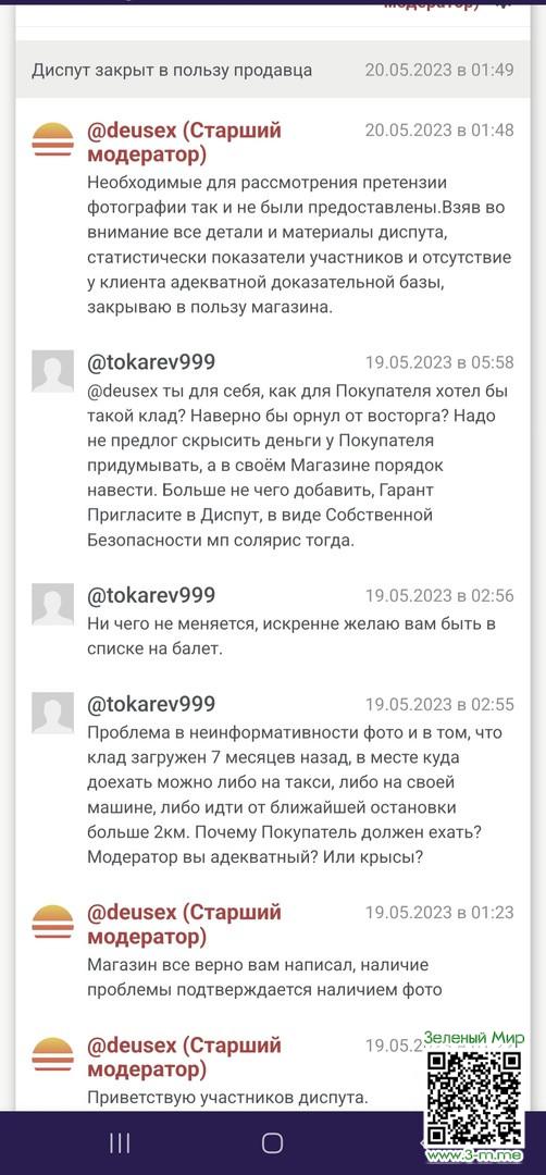 На блэк спрусте есть такой магазин джентельмены. Город Нижний Новгород. Так вот курьер уже пол года делает клады на одной и той же поляне. Итог : клад приделал ноги и на месте нечего небыло. Открываю диспут излагаю аргументы прикрепляю фото и в целом учитывая отзывы магазина думаю что диспут будет в мою пользу. Но нет Модератор решил разделить риски и одобрил только 50% возврата средств. Обходите стороной данный магазин. А уж если попали на проблему и ваш аккаунт слабый удачи не видать